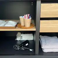 หลังเล่นน้ำทะเล สามารถใช้ฝักบัวแบบเรียบง่ายภายในที่พักเพื่อล้างทราย แล้วเช็กอินได้อย่างราบรื่น