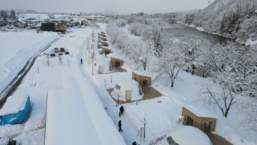เป็นสถานที่สัมผัสประสบการณ์กลางแจ้งที่ล้อมรอบด้วยธรรมชาติและสามารถมองเห็นแม่น้ำโมกามิได้ เต็นท์โดมมีทั้งหมด 8 ห้องพัก ซึ่งแต่ละห้องตั้งชื่อตามภูเขาในจังหวัดยามากาตะ สามารถเพิ่มกิจกรรม BBQ ที่สนุกสนานแบบไม่ต้องเตรียมอุปกรณ์ หรือการนั่งล้อมกองไฟกับคนสำคัญได้ในตอนเช็คอิน ยินดีต้อนรับการนำอาหารมาเอง และหลังจาก BBQ สามารถผ่อนคลายความเหนื่อยล้าที่สิ่งอำนวยความสะดวกน้ำพุร้อนใกล้เคียง