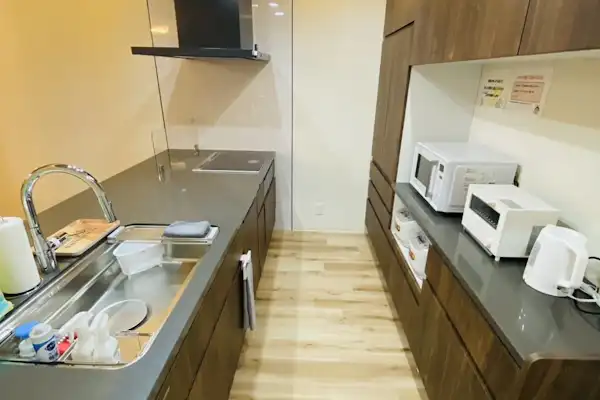 ครัว / เตาแก๊ส / ชุดเครื่องครัวครบชุด / จานชามครบชุด / ฟิล์มห่ออาหารพลาสติกใส่ของสดและอลูมิเนียมฟอยล์สำหรับประกอบอาหารต่างๆได้เองง่ายๆที่บ้านคุณเอง! ตู้เย็นขนาดใหญ่พร้อมช่องแช่แข็งด้านบนสุด! ไมโครเวฟไฟฟ้าแรงสูง! หม้อไฟฟ้าแรงสูง! หม้อไฟแบบญี่ปุ่น×2 ใบ และเตาแก๊สแบบพกพา×2 เครื่อง [กรุณานำถังแก๊สมาด้วย] พร้อมเตาย่าง "ยากิมารุคุง" ×3 เครื่อง