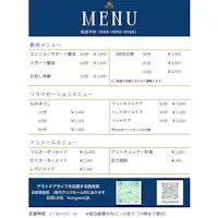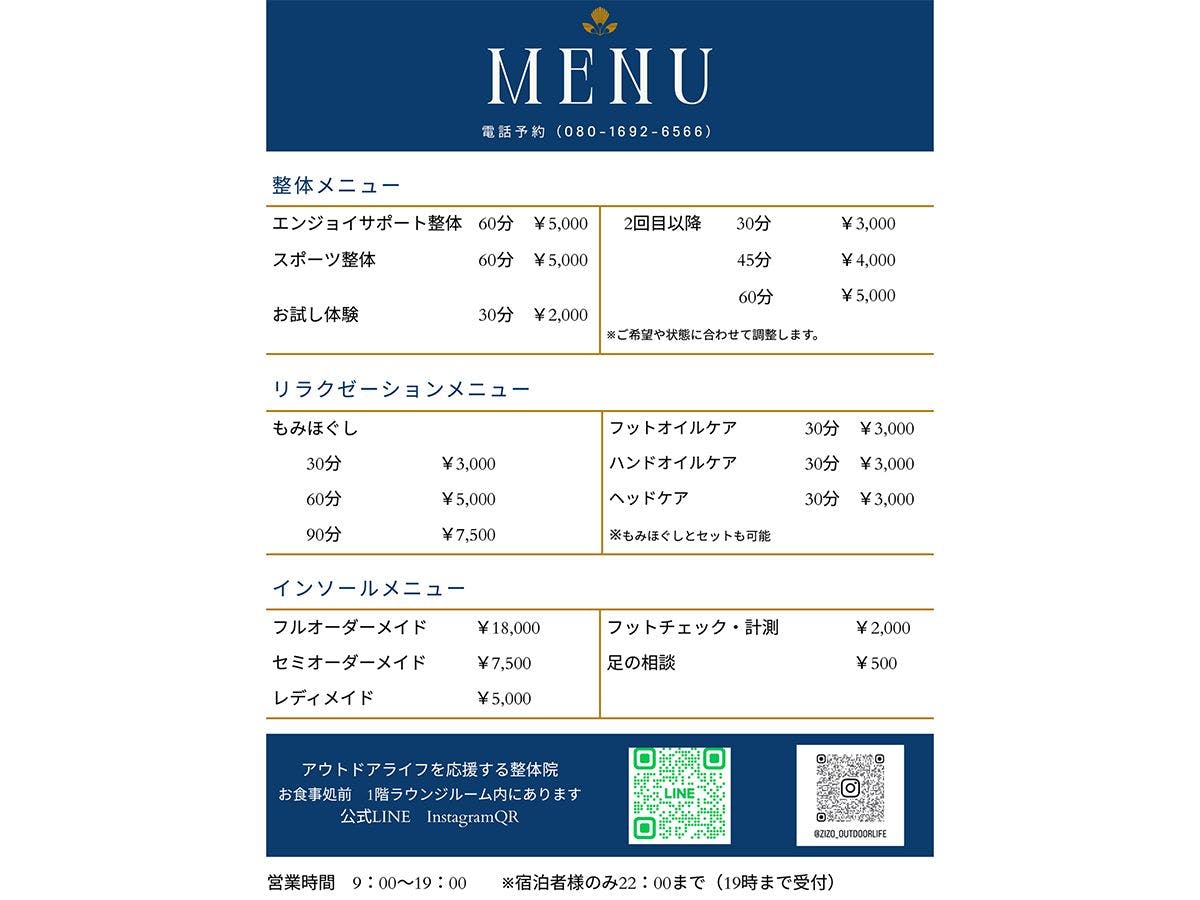 ・ค่าบริการ(ผู้เข้าพัก): มีค่าใช้จ่าย ・ค่าบริการ(ผู้มาเยือน): ร้านนวดบำบัด: 9.00 น. - 19.00 น. ※สำหรับผู้เข้าพักเท่านั้น - ถึง 22.00 น. มีเมนูพิเศษสำหรับผู้เข้าพัก! ※กรุณาสอบถามรายละเอียดเมนูเพิ่มเติม