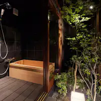 誰にも邪魔されないプライベートな時間。やすらぎの空間で過ごす非日常の時間。 ご家族やグループにもおすすめの1日1組限定一戸建ての離れです。 お風呂は開閉式の露天風呂を採用しており、閉めれば内風呂、開ければ半露天風呂をお楽しみいただけます。 静かな雰囲気のなかで、プライベートなひとときをお楽しみください。