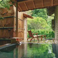 山紫水明の谷間に佇む名水の宿、峡之家。 大きな窓とデッキから表情豊かな風景を楽しめる、総面積300平米のゆったりとした空間。 130年の時を過ごしてきた宿で、檜の香りに包まれながら露天風呂をお楽しみいただけます。