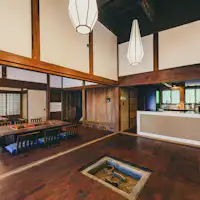 河口湖からもほど近い、山間の町、芦川に在る一棟貸しの宿。 100平米を超える間仕切りのないひとつの空間は、一棟貸しでの滞在を存分に楽しむことができます。重厚な梁や柱に囲まれた日本の伝統建築の空間をご堪能ください。