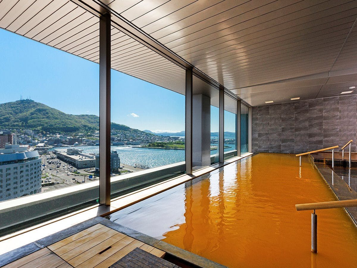 走上配有无边际温泉的顶层甲板,满天繁星点缀着深蓝色的夜空。 脚下是平静的海面和雄伟的函馆山。 充满天然温泉的温暖渗透到心灵深处。