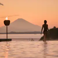 俯瞰大海的40米长无边际泳池。随风摇曳的棕榈树、一天之中变幻万千的天空,与泳池点燃的火焰如镜面般相互映照,营造出梦幻般的世界。