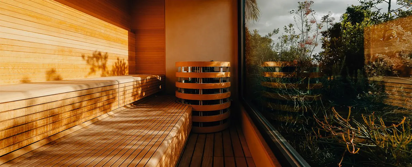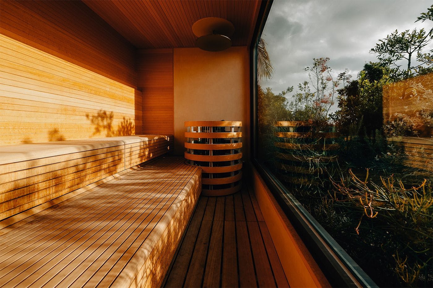 泳池旁设置的集装箱桑拿。通过整面玻璃的大窗户可欣赏植物景观。桑拿后,享受经冷却器降温的冷水淋浴,再跳入泳池,也是BPC独有的乐趣。 室内温度:100℃,淋浴:13〜15℃