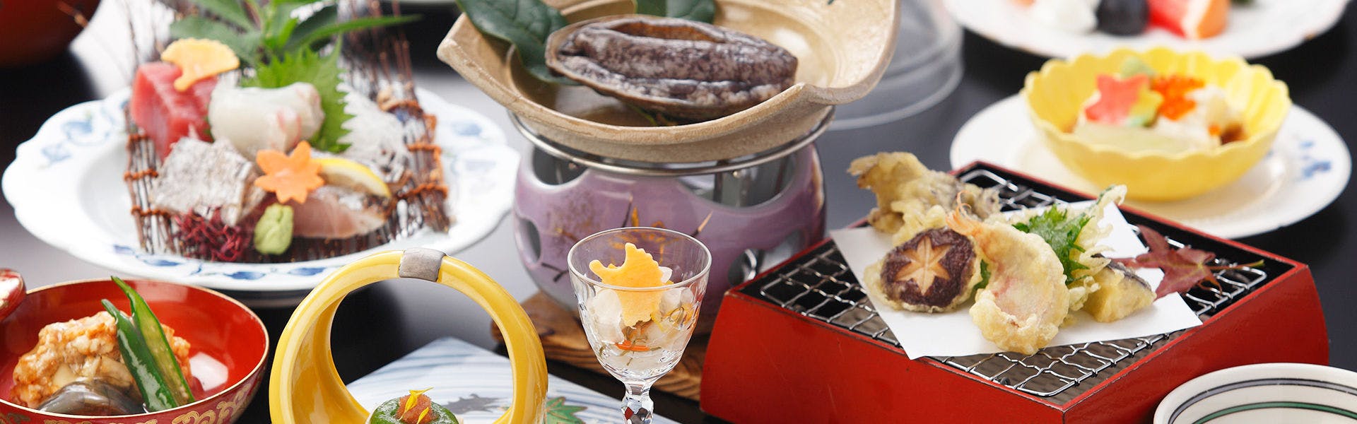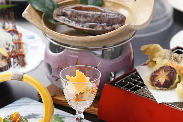 主菜有“鲍鱼舞烧”、或“国产牛陶板烧”、“金目鲷涮涮锅”、“樱虾釜饭”等多种选择。其中最具特色的是哈特皮亚热海的招牌料理——“鲍鱼舞烧”。将活鲍鱼淋上日本酒,蒸烤而成。通过蒸烤,鲍鱼变得非常柔软,鲜味浓缩。我们精心挑选四季食材,打造奢华会席料理。请尽情享受主厨用心呈现的美味佳肴。