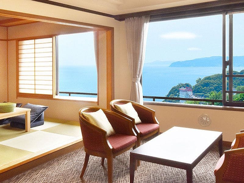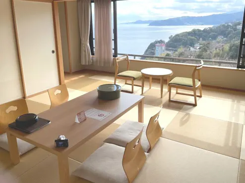 本馆位于伊豆山的高地,从房间可以一览相模湾。以优越的地理位置和水量丰富、泉质柔和的温泉为自豪。本馆诚邀您尽情欣赏相模湾的绝美景色。