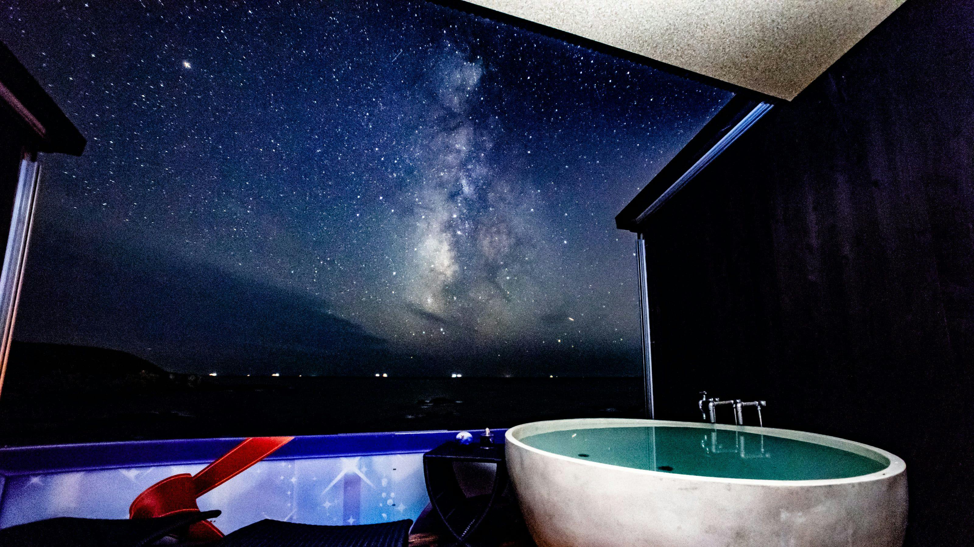 放眼望去尽是大海与地平线,还有流动的云朵。推荐的夜景是满天星空与流星雨,甚至有时在视线高度也能看到星星! 你体验过自然光下夜晚的明亮吗?月夜里,海面上会出现耀眼的“月光之路”。在寂静之中,耳边只听得到海浪声。 请在房间的露天浴池中,一边享受最棒的温泉,一边尽情放松!
