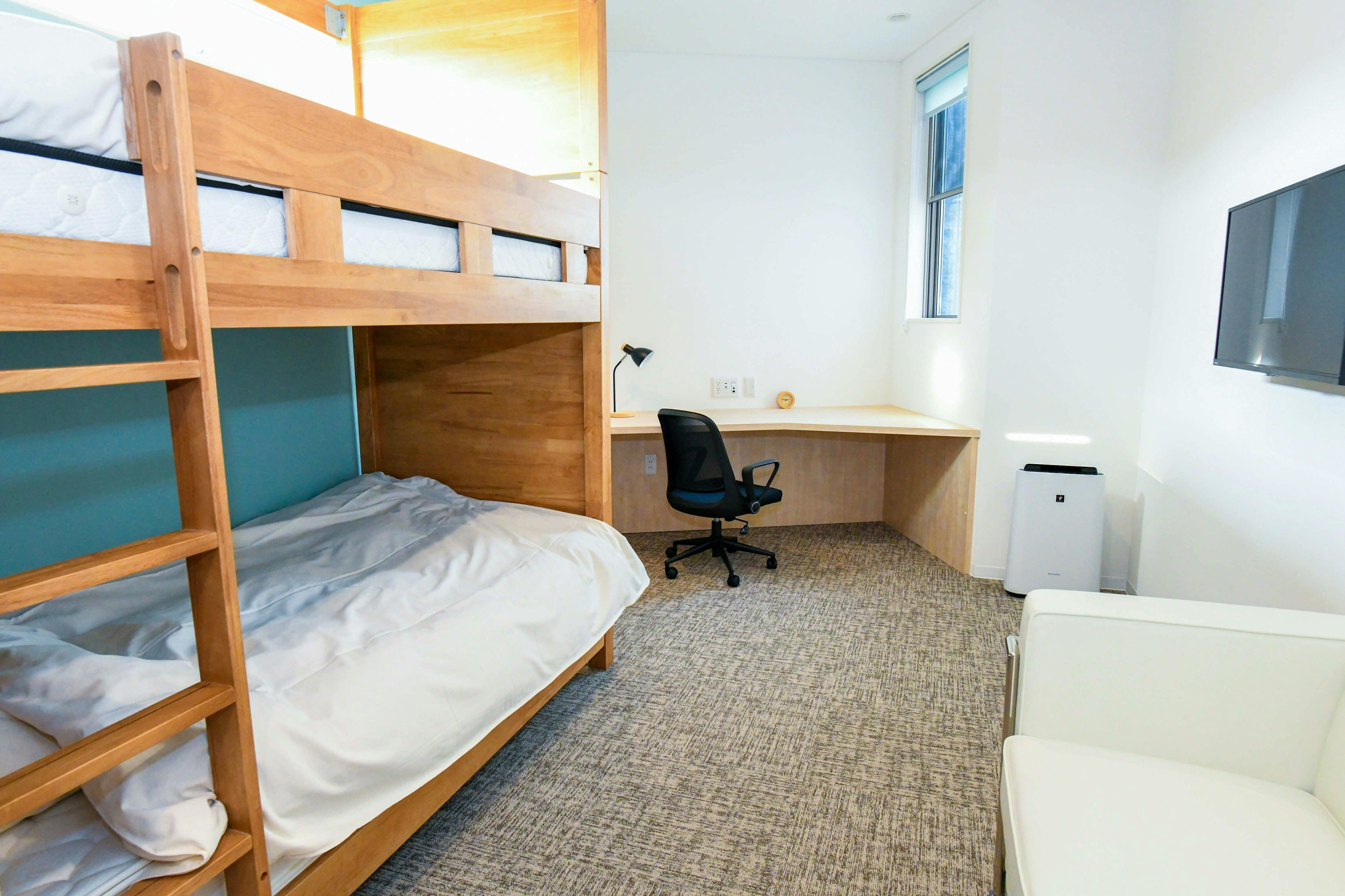 一楼的共享空间配备了50英寸电视、传真机、复印机等办公设备,并设有可自由进行会议的空间,工作所需设施一应俱全。 您还可以在阳台呼吸新鲜空气的同时进行工作,是适合共创办公或研修旅行的酒店。 此外,还设有共享厨房和大型冰箱,适合长期住宿,居住舒适无压力。