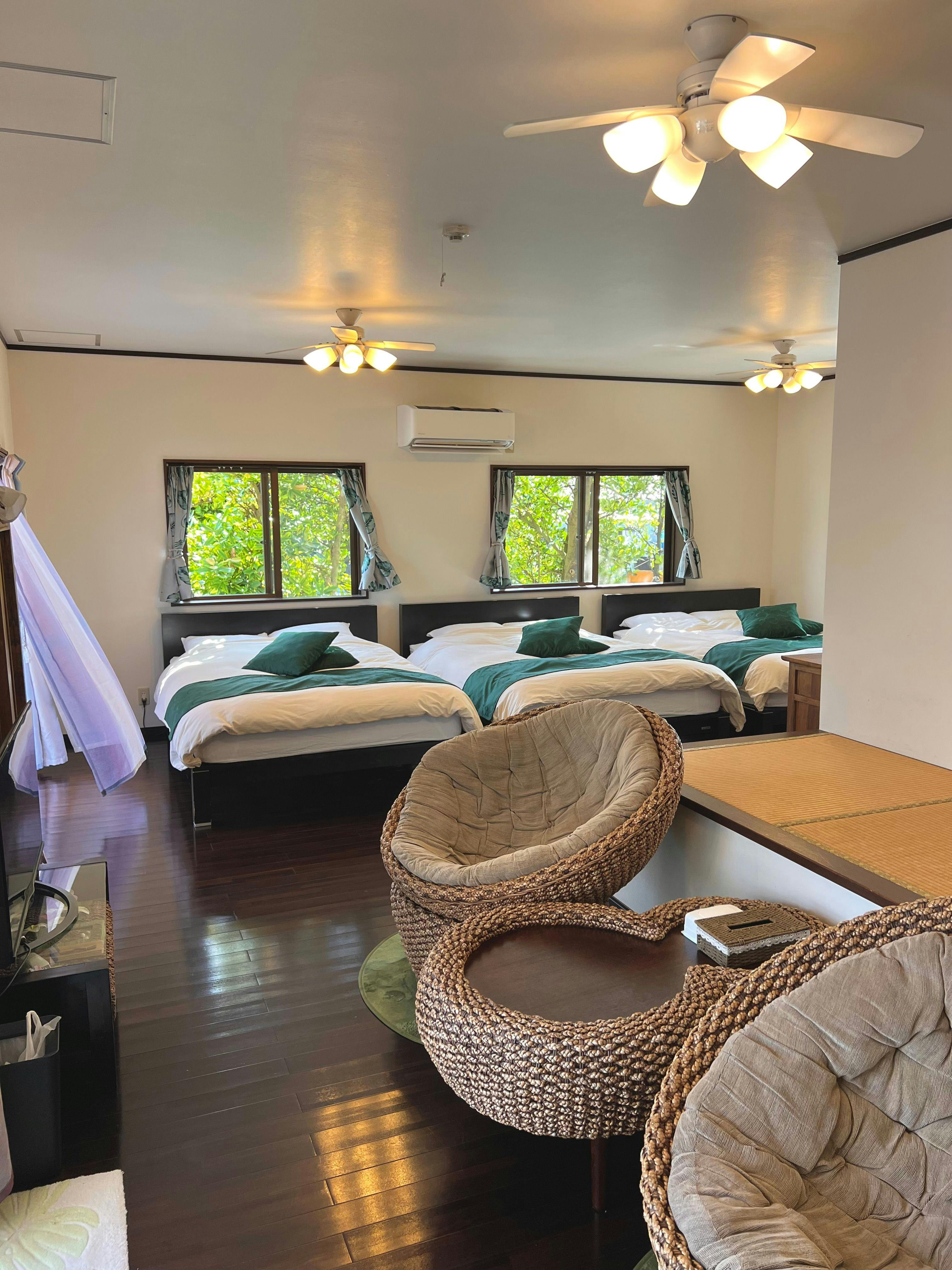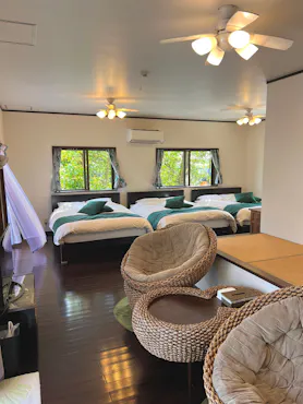 从住宿步行30秒即可到达透明度极高的备濑海岸。夕阳就在眼前的大海中落下。夜晚可以仰望满天星空!在接触冲绳自然的同时,享受一场非日常的旅行吧!此外,由于住宿内设有海洋用品店,提供丰富的海洋用品。还有皮划艇和SUP的浮潜之旅。从住宿出发,活动结束后即可返回住宿,能够舒适顺畅地享受海洋活动!备濑海岸是受欢迎的浮潜景点。不需要费力寻找,就能看到五彩斑斓的鱼群。在退潮时甚至可以从水面上看到! 住宿周边还有许多观光名胜。(福木林道——步行2分钟,美丽海水族馆——车程5分钟,濑底岛——车程18分钟,古宇利岛——车程30分钟) 此外,不仅在办理入住和退房时,在您入住期间,工作人员也会细心周到地提供支持,并与您愉快交流。请放心使用我们的服务。 请享受宁静悠闲的时光。