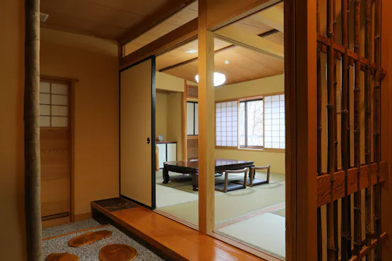 里之湯是一間擁有全9間房間的住宿,其中包括附有露天風呂的獨棟「花村」客房。 被樹林間穿梭的微風、潺潺流水聲以及鳥鳴聲所包圍,這是只有被自然環繞的里之湯才能提供的心靈放鬆空間。 除了3個可供包租使用的溫泉之外,每個房間內設有古代檜木製成的浴池,並引入源泉,因此即使在房內也能盡情享受溫泉帶來的恩惠。