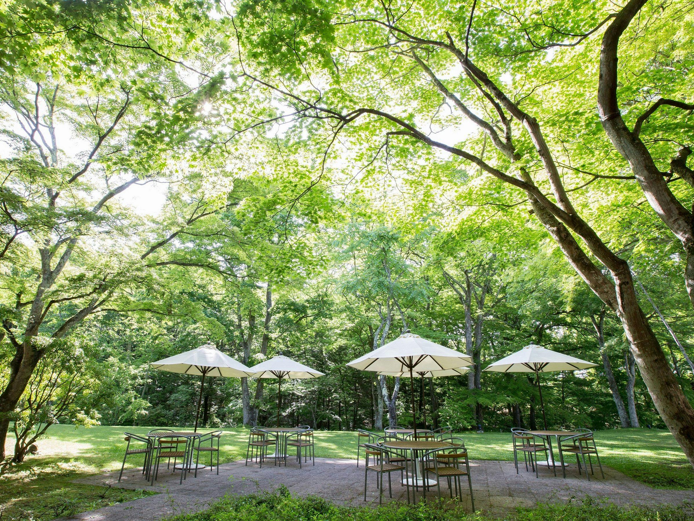 與輕井澤自然融為一體的兩層樓飯店。被落葉松林環繞的1萬坪飯店庭園中,鳥兒鳴唱,松鼠親子嬉戲玩耍。