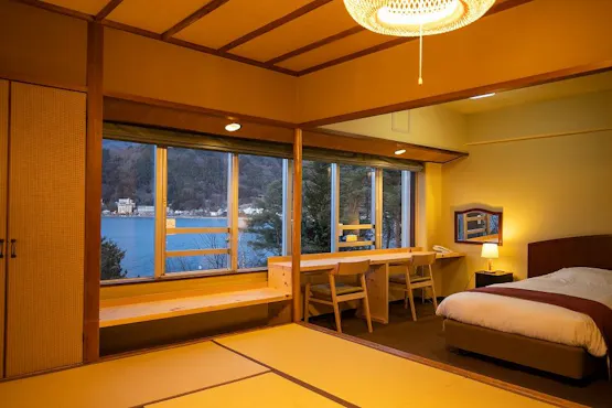 While the exterior has a retro Showa-era feel, the interior has been thoroughly renovated. We checked in in a relaxed lounge setting while receiving an explanation, chose our yukata and amenities, and were shown to a Mt. Fuji–view Room on the 7th floor of the West Wing. It was a clean guest Room with a huge Mt. Fuji view right in front of us—truly luxurious. There were four adults, and we also used the sofa bed, but we slept well.The buffet at the 7th-floor restaurant offered outstanding views of Mt. Fuji and Lake Kawaguchi, allowing us to take our time, and it was impressive how delicious each dish was at both dinner and breakfast. Alcohol is included. The wagyu steak, sausages, sushi, dessert breads, and more were excellent.All staff members—from younger employees to veterans—were very well trained, and their hospitality felt like that of a long-established hotel; it was truly comfortable. I’d love to stay again when I visit Lake Kawaguchi next time.