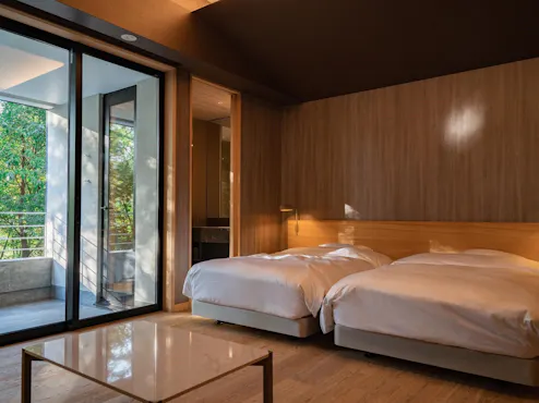 被森林環抱的日式旅館。盡情享受美味的餐點、舒適的床鋪,以及每間客房內設的露天溫泉。