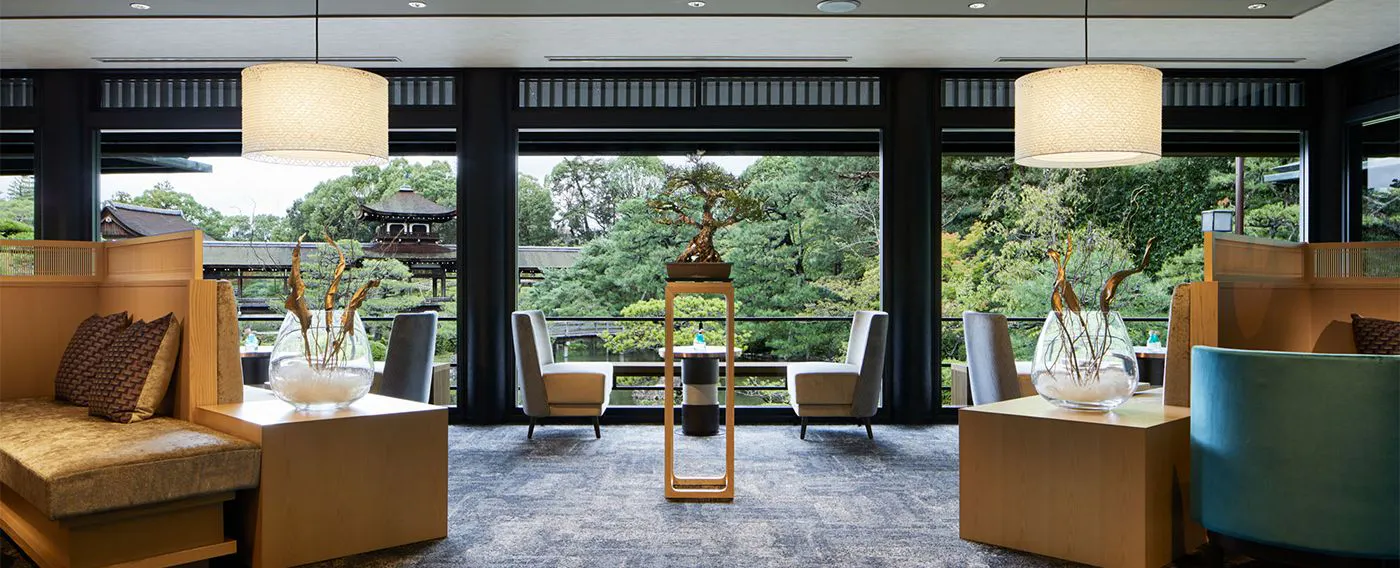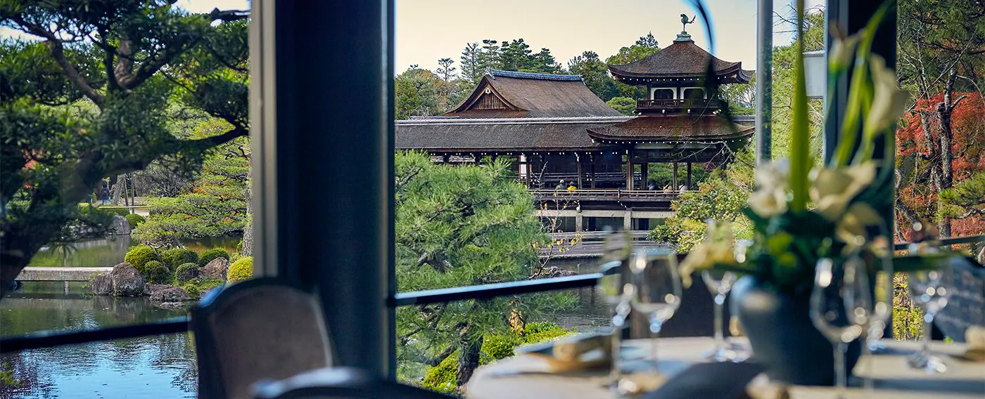 朱紅色的醒目建築、充滿傳統與格調的觀光名勝——平安神宮。早餐將於境內的平安神宮會館為您準備。 會館緊鄰占地約1萬坪的名勝「神苑」,從窗邊即可眺望優美的日式庭園景致。 春季可賞紅枝垂櫻、秋季可觀紅葉等四季風情,請一邊感受京都時令之美,一邊享用選用京都當季食材製作的日式早餐。