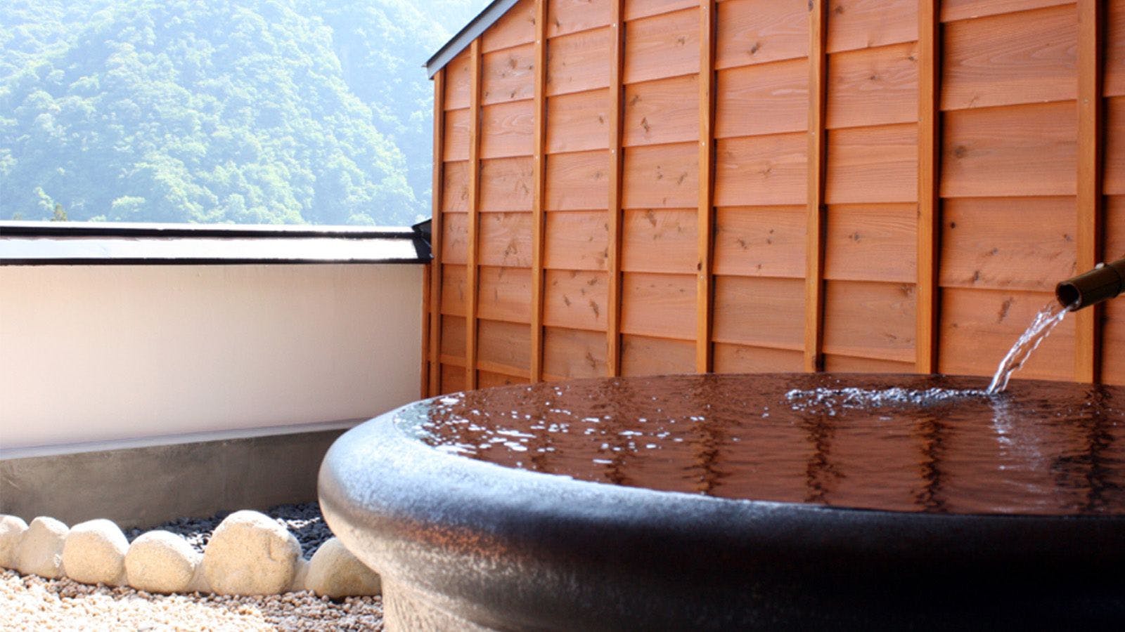 我們利用從後山鐘乳洞數百年前就湧出的源泉,供大浴場與露天風呂使用。 在附露天風呂的特別房間中,使用與大浴場不同的泉質,讓您享受其他房間無法體驗的溫泉。 溫柔滑順的泉水,歷經長久歲月從未枯竭,湧出量豐富,湯花盛開且高鹼性(含有率高的有效成分)的泉質堪稱天然熱礦泉水。 男女皆可享受無屋頂設計、充滿開放感的露天風呂。 景色更是壯麗遼闊,一覽無遺。