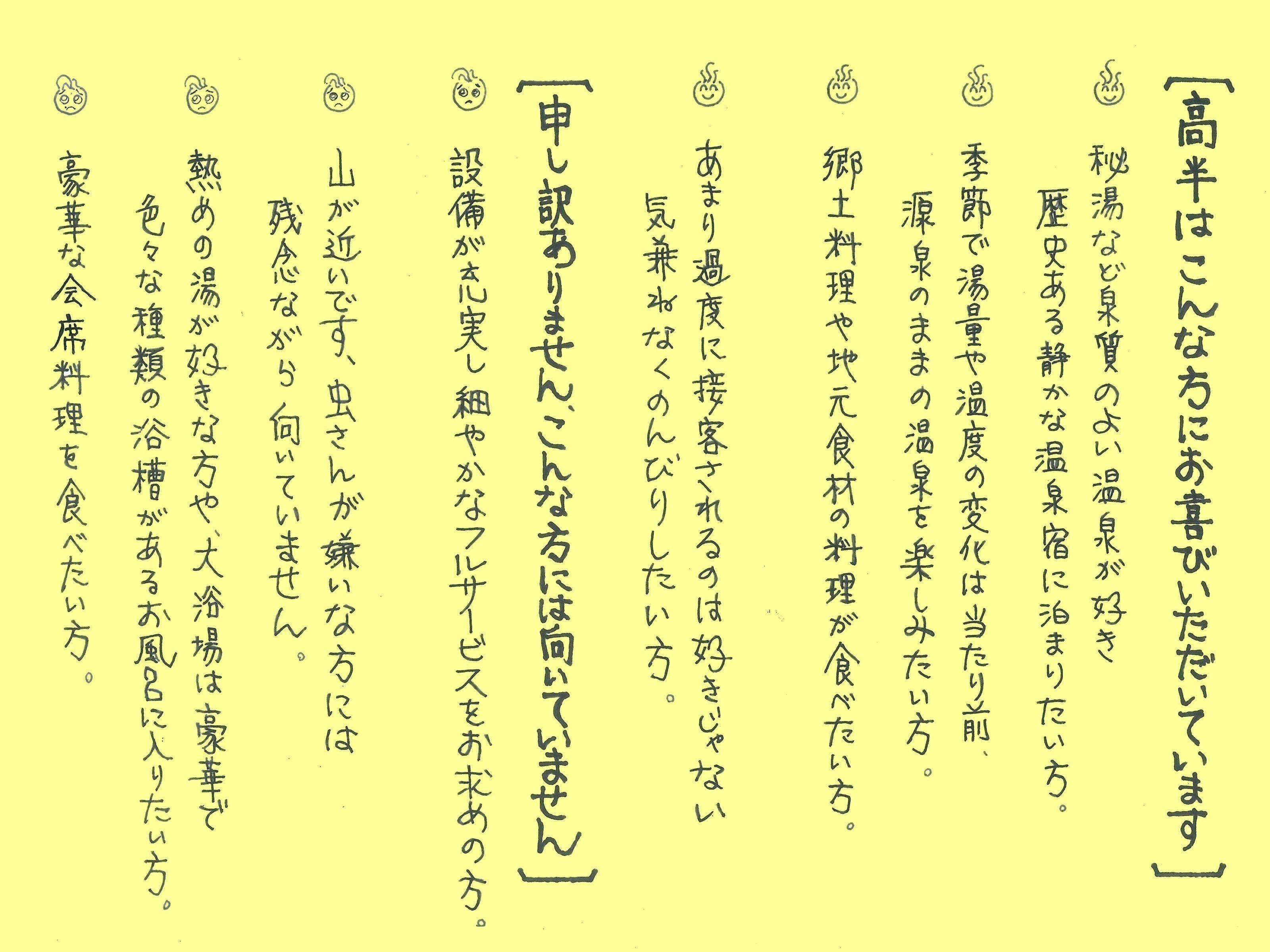 與湯澤其他溫泉井不同,高半的溫泉是天然湧出的源泉。由於未經氧化,能直接作用於細胞,具有卓越的療效。 在不加水或調節溫度的情況下保持43度,這對於天然湧出來說確實是奇蹟。這是一個以極高新鮮度為特徵的溫泉。