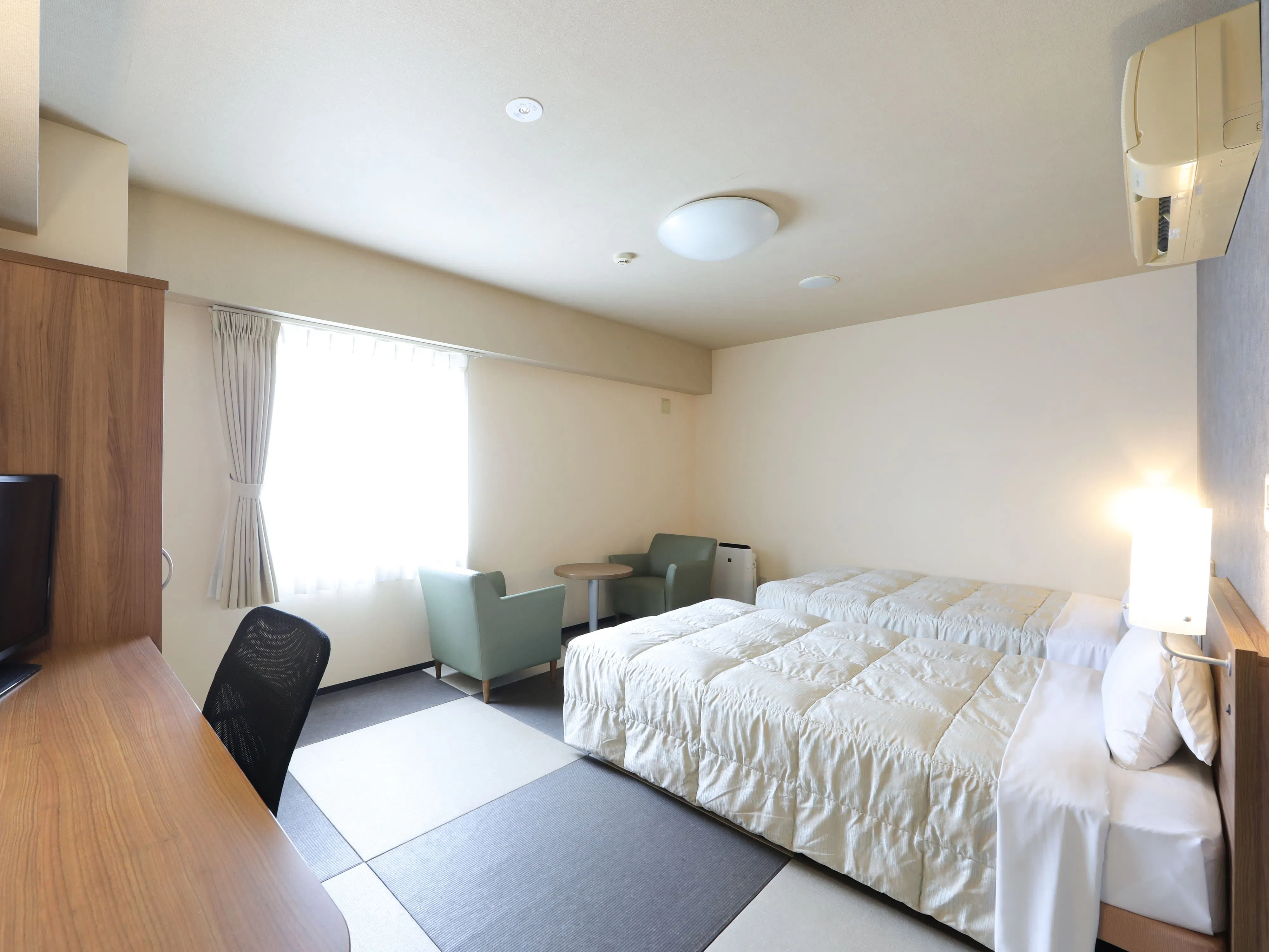 I stayed in a twin Room. As the title suggests, the Room was spacious and very comfortable. The floor was not carpeted but had a tatami-style design, allowing me to relax without shoes. The only downside was the lack of a large public bath like nearby Hotels, but the Room was quiet, the Wi-Fi connection was strong, and the complimentary breakfast was delicious. I would love to stay here again next time.