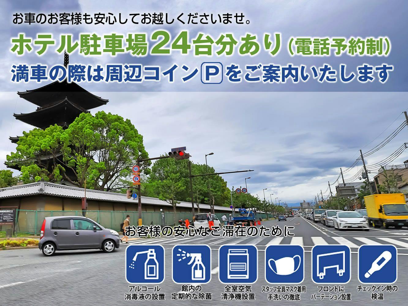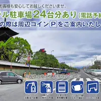 ・費用: 住宿者每晚 ¥1,000 ・停車時間: 15:00~翌日10:00 ・停車位空間: 車長度 --- 車寬 --- 車高 --- ・停車場數量: 12台 ・代客泊車服務: 無 停車場需預訂。請致電飯店完成預訂。每晚費用為¥1100(含稅) TEL:075-691-0100 使用時間為下午3點至退房日早上10點。
