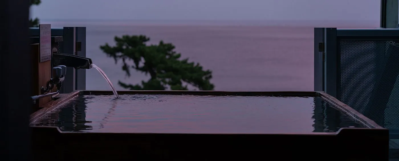 ■包棟露天溫泉(共7處)免費 無需預訂,只要空著即可隨時多次使用。 您可以在房間內使用手機確認浴池的空閒狀況。 ●別棟「濱之湯」(舊:大浴場)3處 循環過濾式 1.「長濱」2.「白濱」大型包棟浴池(露天溫泉・室內浴池) 3.「弓濱」包棟露天溫泉 庭園風格 AM 6:00~9:00 & PM 1:00~11:00(時間內可隨時使用) ●展望包棟露天溫泉(本館屋頂)4處 放流・循環併用式 1.「天」信樂燒 2.「海」高野槙 3.「空」木曾檜 4.「風」御影石 24小時(空著時可隨時使用) ●附露天溫泉的客房使用時 24小時(使用時溢流,溫泉掛流)