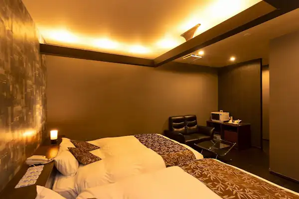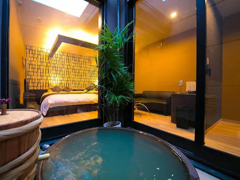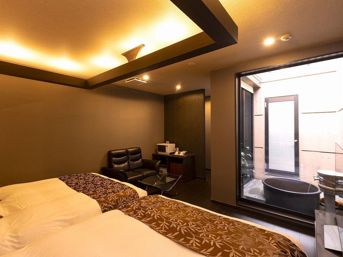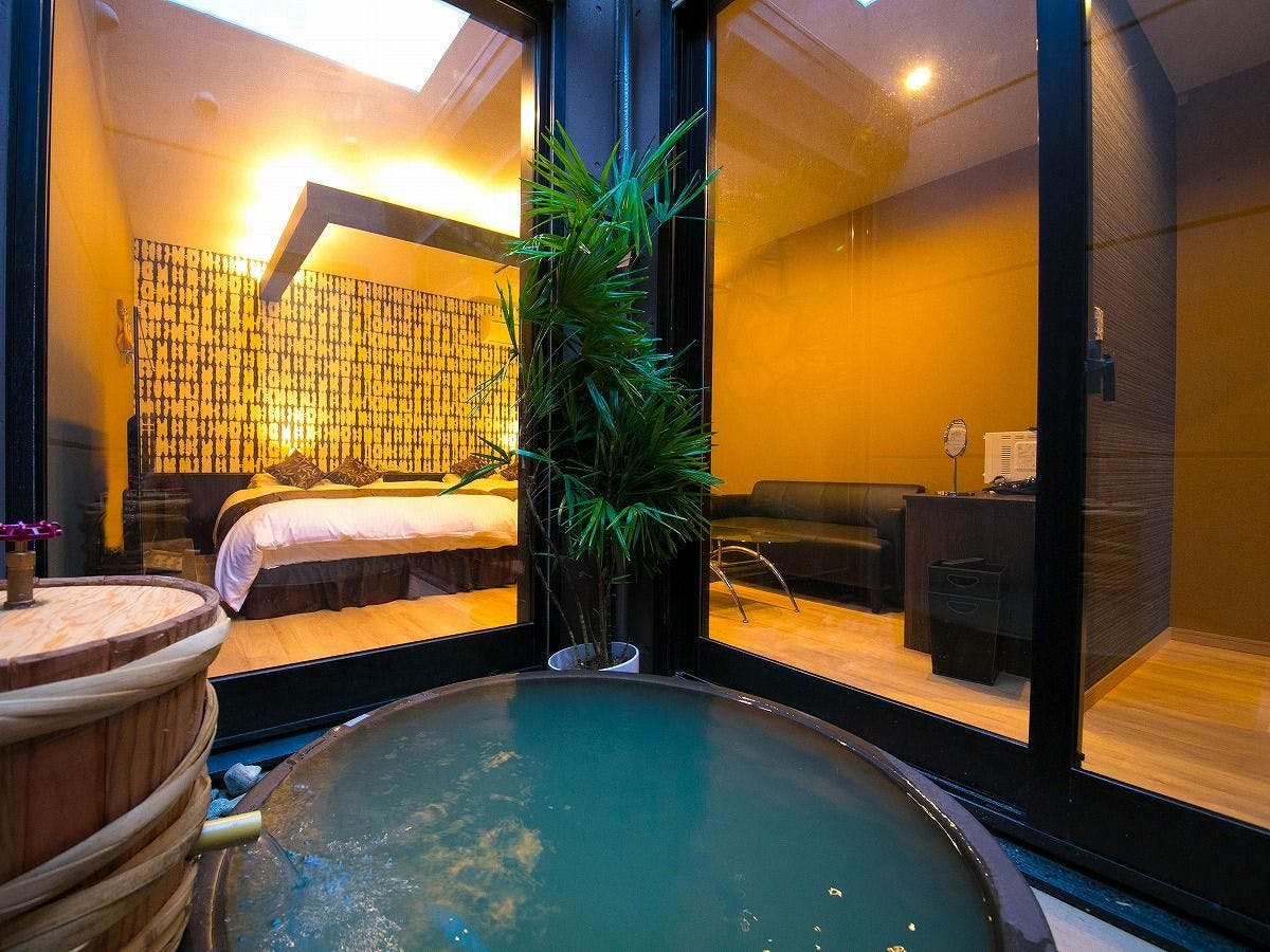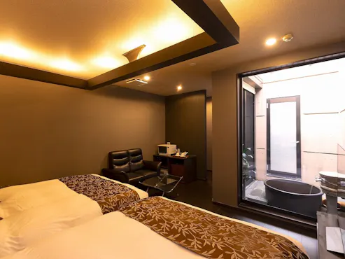 大分市大在。擁有適合商務及觀光的絕佳地理位置。通過擁有噴泉的花園前往各客房的通道,能讓您感受到非日常的氛圍。此外,您還可以在私人空間中盡情享受100%源泉放流的大分溫泉。客房為和洋室,設有兩張雙人床及六帖琉球榻榻米的空間,並配備室內浴池及露天浴池(附電視・岩風呂)。此外,還提供可連接Wi-Fi的設施,以及負離子吹風機、化妝水、乳液等豐富的備品。