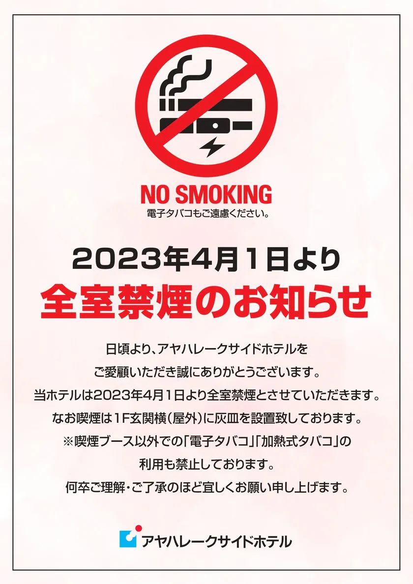 本飯店自2023年4月1日起全室禁菸。