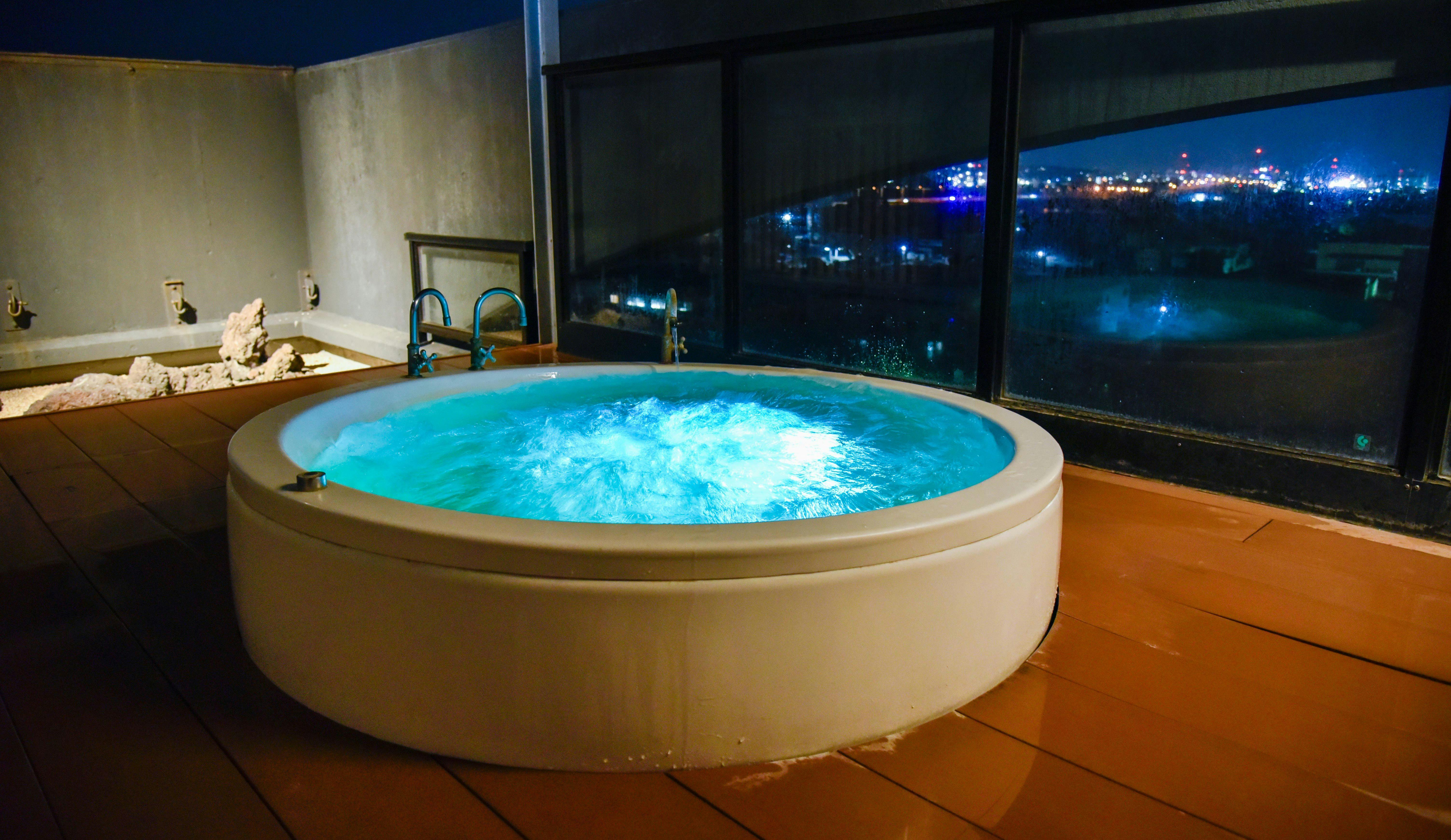 屋頂上有三處可供包租的露天溫泉浴池,是全國少見的茶褐色溫泉。 泡湯後,全身肌膚會變得滋潤光滑,特別推薦女性朋友親身體驗這種功效。 從充滿開放感的屋頂露天溫泉浴池,可以欣賞到大分市區的夕陽美景,日落後則可觀賞工業區的夜景與按摩浴池彩燈交織出的夢幻光影。 展望露天溫泉浴池為非預訂制且非包租制,若無人使用,您可於喜歡的時間段自由使用。 請搭乘電梯至8樓,然後從8樓經由樓梯前往屋頂。 若有其他客人使用,8樓的電子看板會顯示相關資訊,請確認後再使用。 ※雨天時無法使用,敬請見諒。
